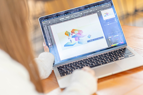 制作は、まず手描きのラフからスタートし、タブレット端末で色を付け、図形を組み合わせ3Dにして仕上げました。